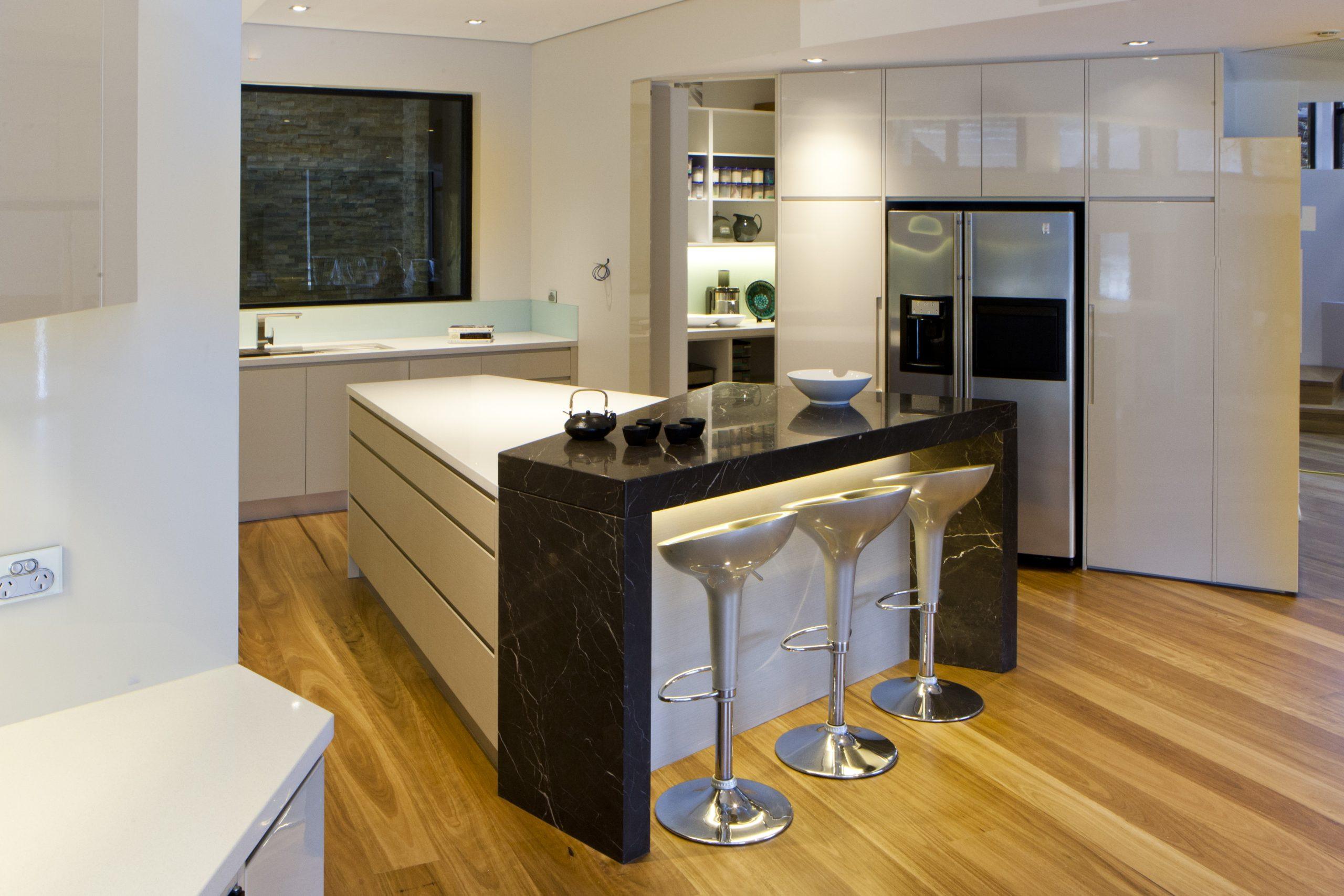 ~ Benchtop Perimeter and island benchtop in 40mm Caesarstone White Shimmer, breakfast bar in 100mm Empire satin marble