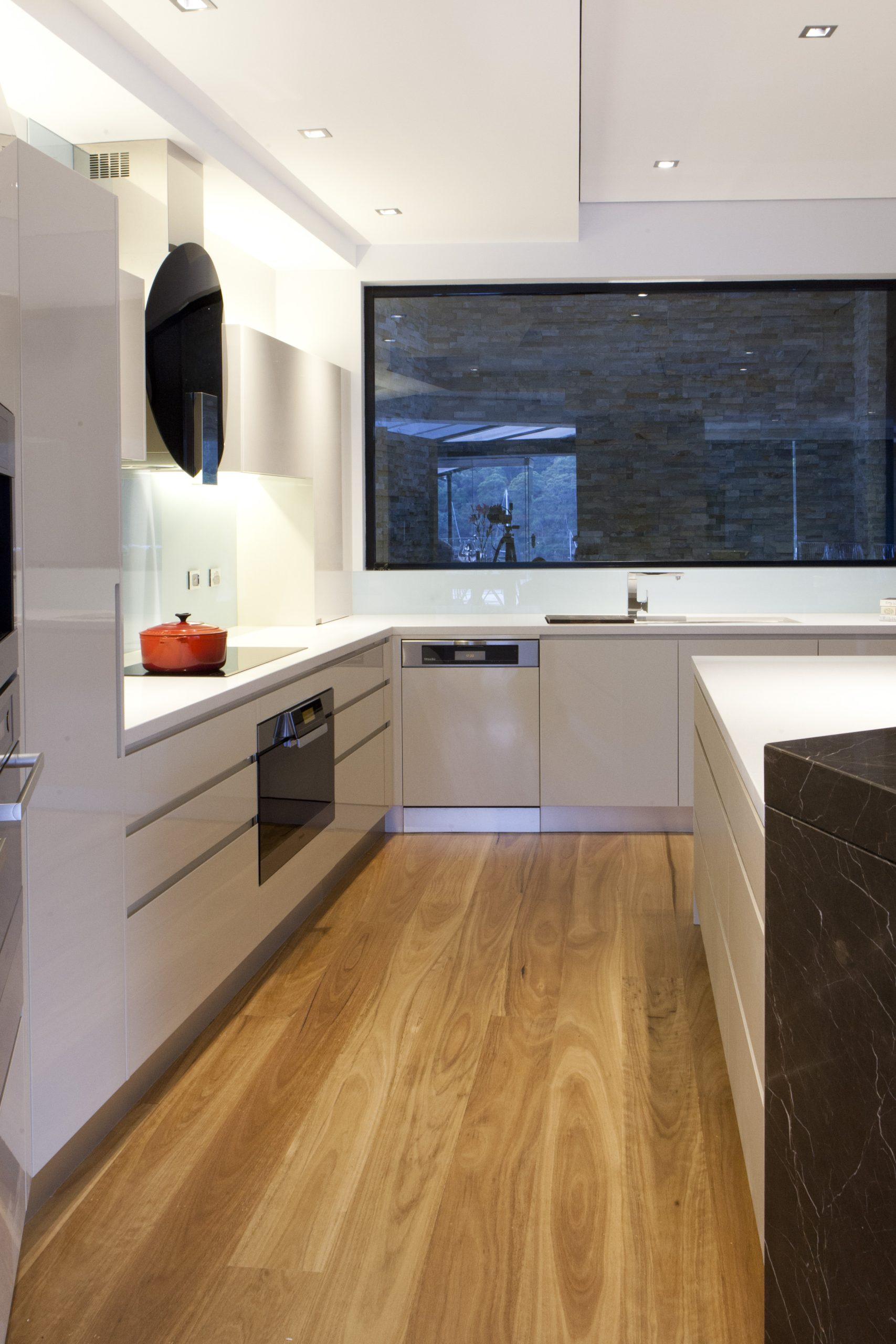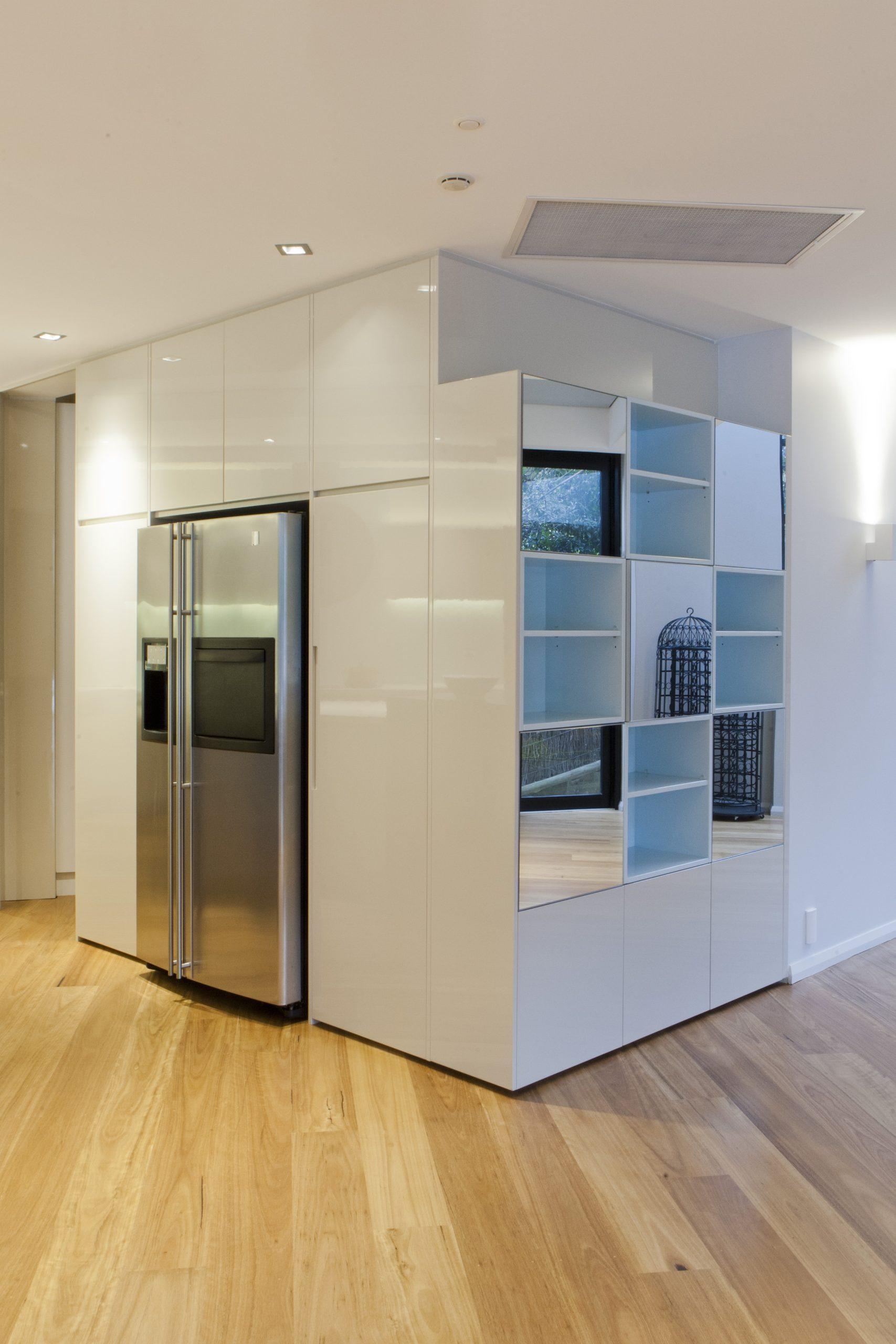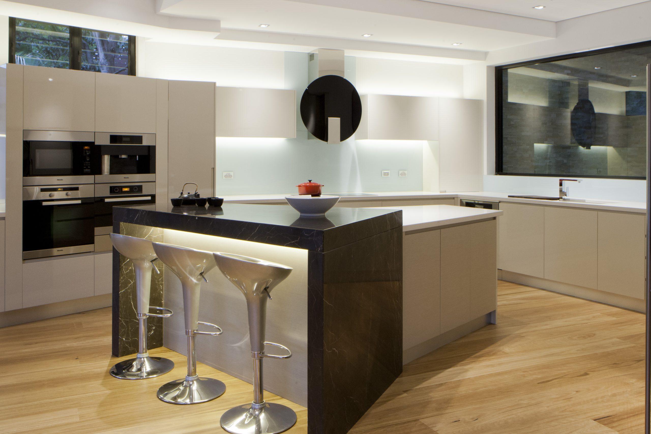 “This waterside home required an impressive yet casual kitchen to suit the owners’ relaxed lifestyle and the architectural design of the home. A contemporary look was achieved using bold geometric forms that echo the shape of the space. The two intersecting trapezoids forming the island are a striking focal point while providing generous bench space within easy reach of the refrigerator. With a nod to the shape of the sailing boats outside, the angled island visually balances the space and creates a smooth flow to the main work area. A mirrored display unit and drinks cabinet with mirrored splashback reflect the waterfront view throughout the space.