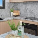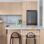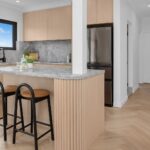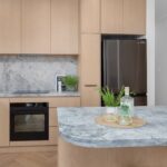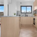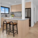A neutral aesthetic was chosen for kitchen with warm timber tones and natural stone