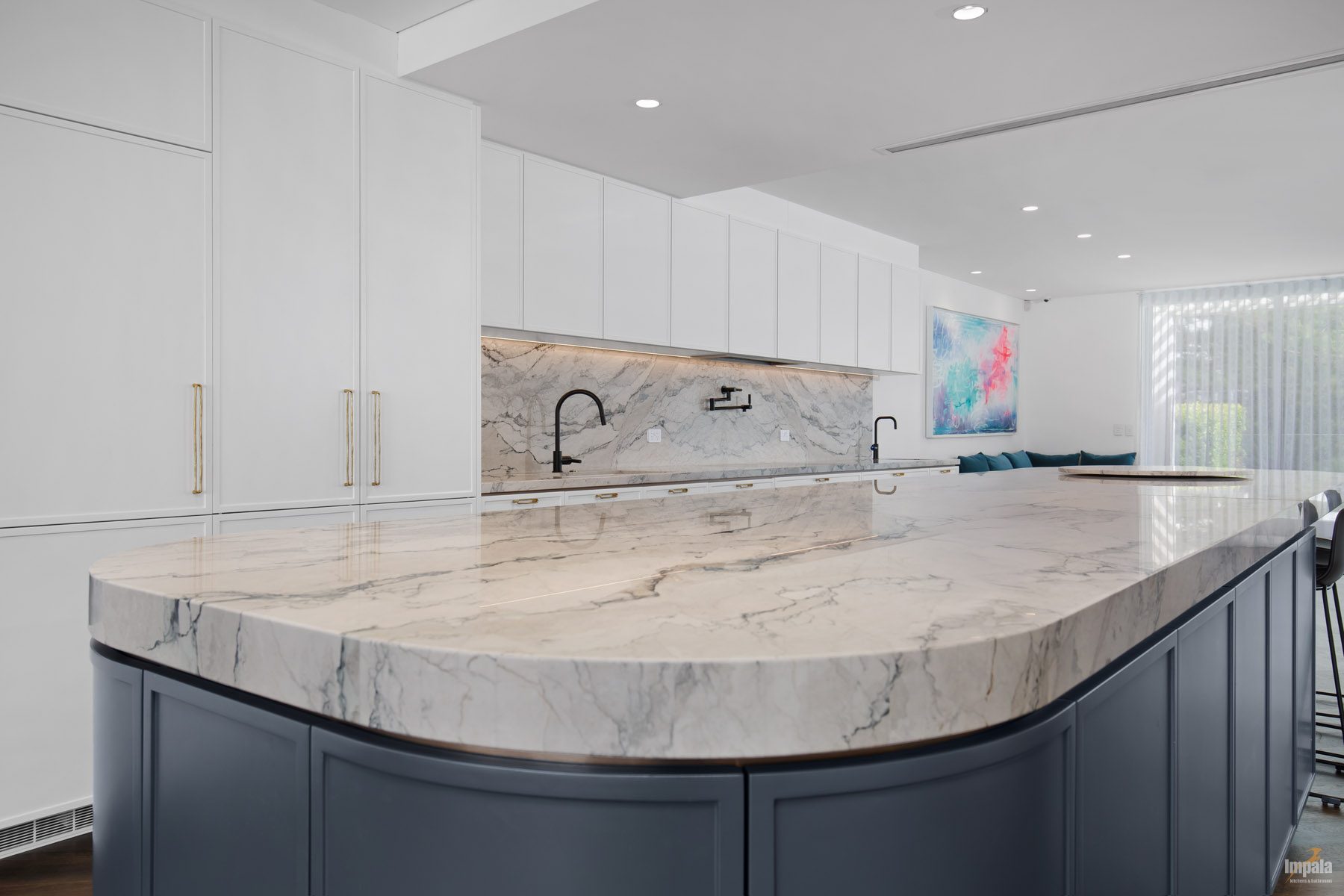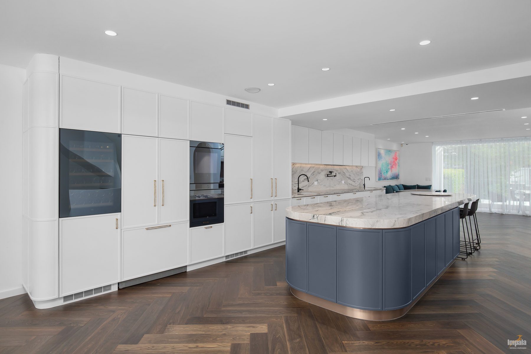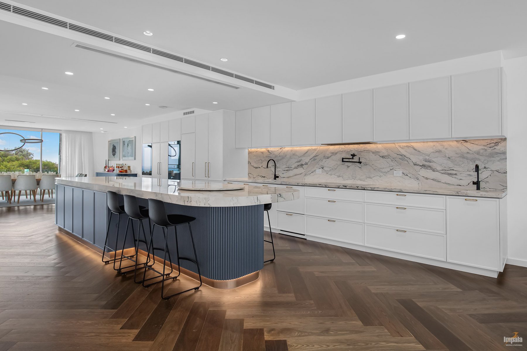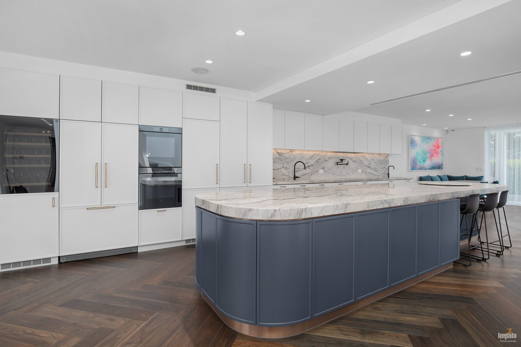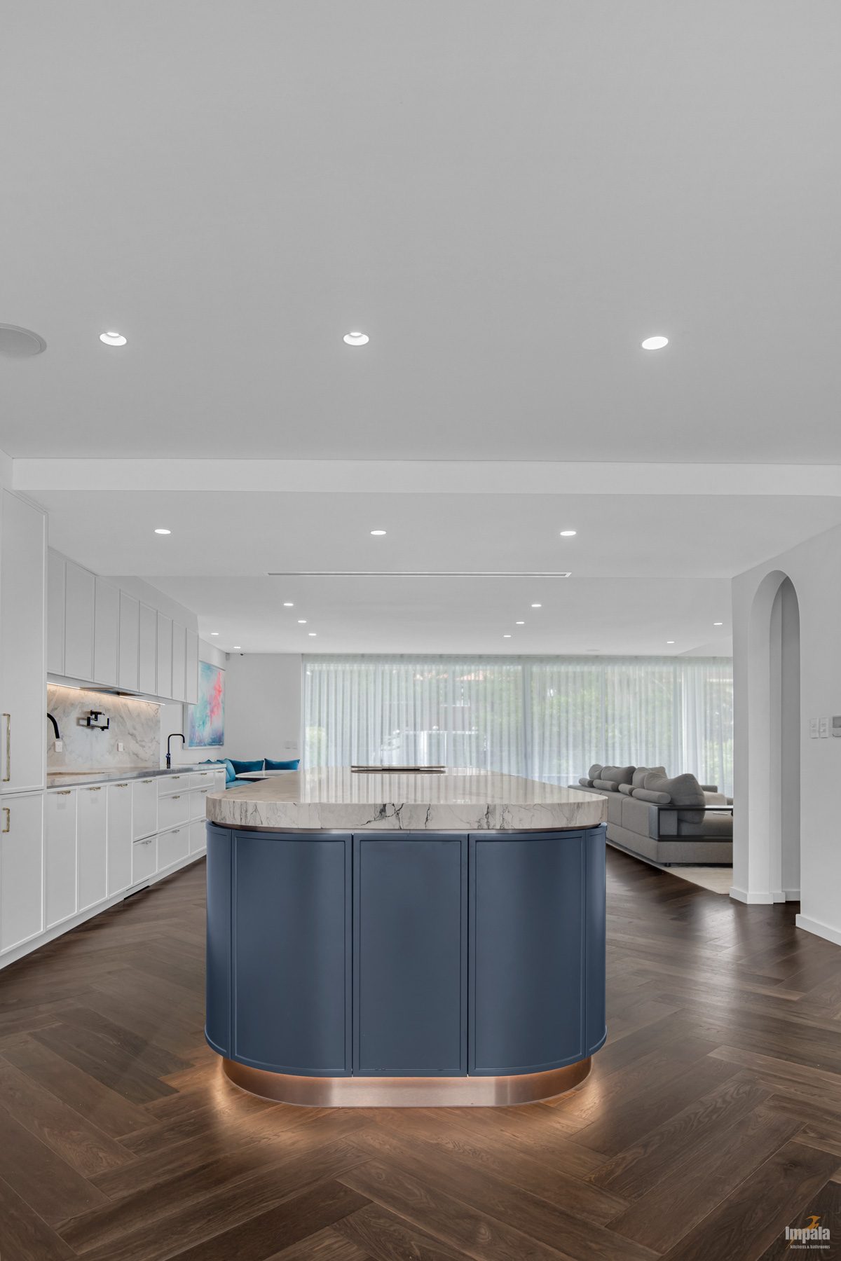 A curved marble island bench anchors the space, inviting interaction and flow throughout
