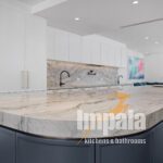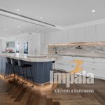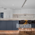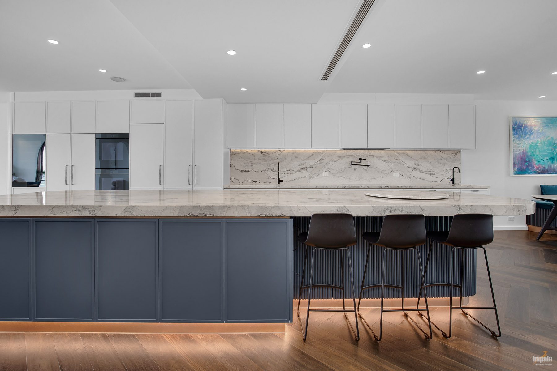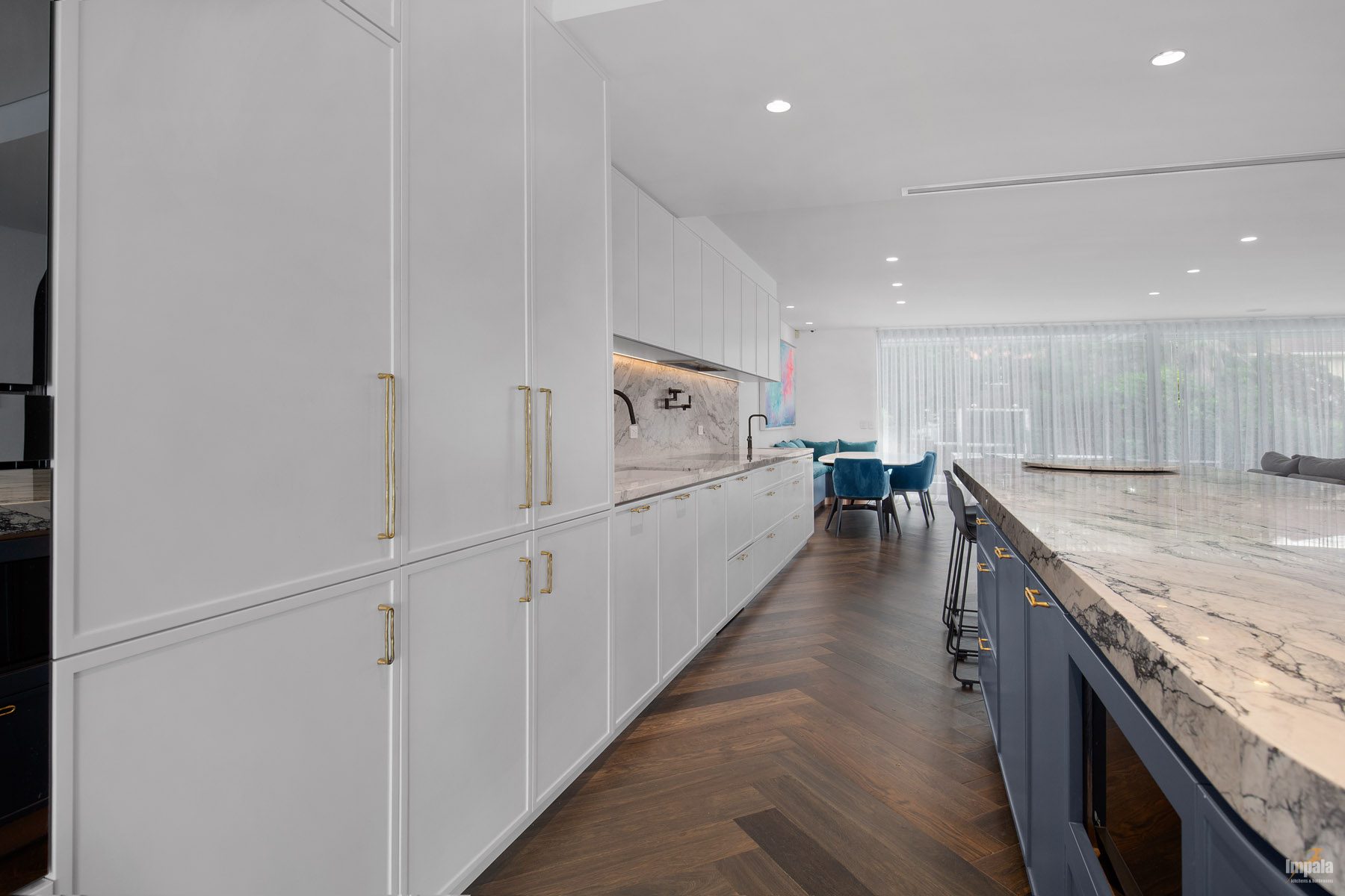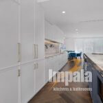 benchtops and splashback, and elegant gold accents, this space effortlessly blends timeless