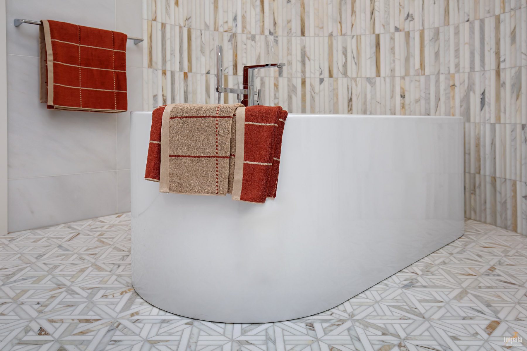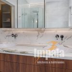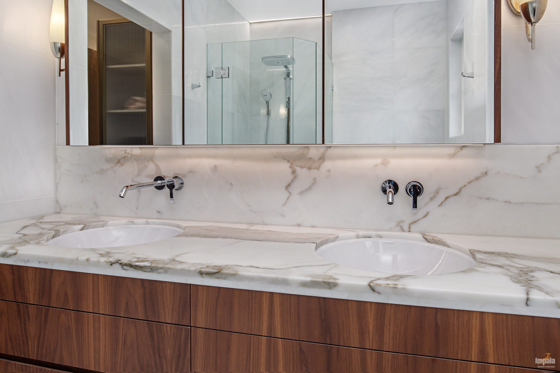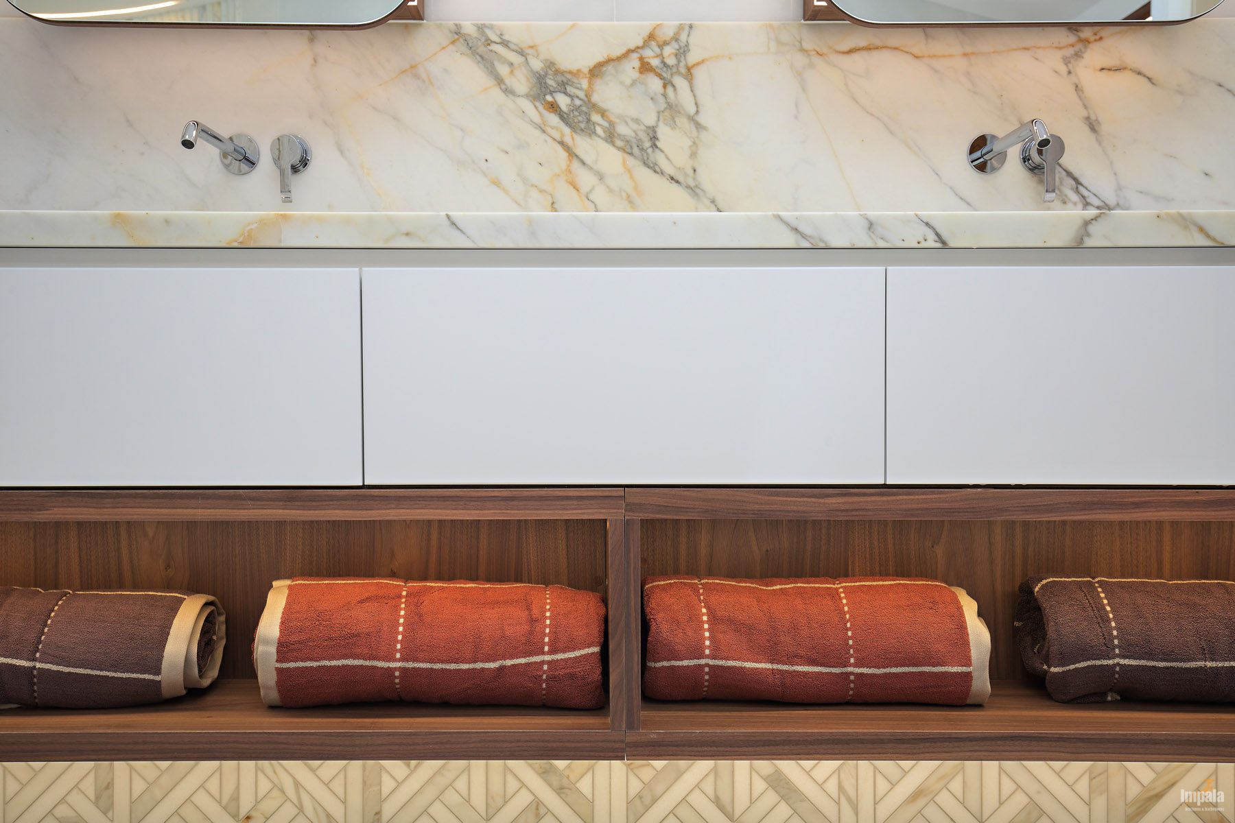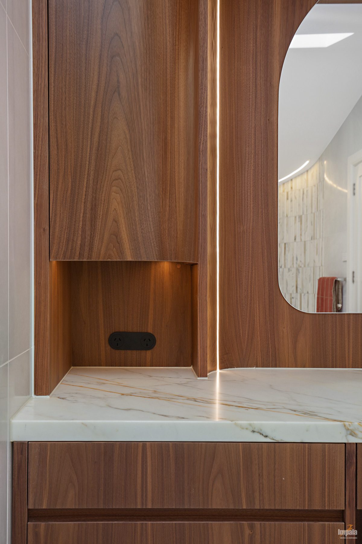The master ensuite is more than a bathroom, it’s a private retreat, a space to unwind and reset. At Impala, we specialise in creating interiors that merge functionality with timeless design. One of our favourite pairings for a truly indulgent ensuite is American Walnut Veneer with Paonazzo Honed Marble. Together, these materials bring warmth, elegance, and sophistication to a room designed for relaxation.