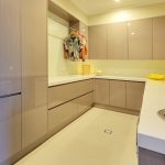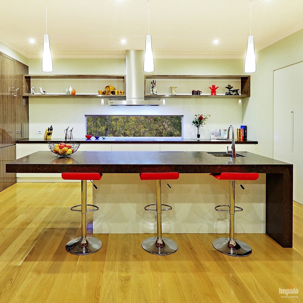 Impala’s client was building a new home in a rural area of Sydney. The client commissioned Impala to design joinery throughout the house, including the kitchen, laundry, vanities, BBQ area and wardrobes. Thesurroundings were a big influence on the colour scheme and materials used throughout the home, with the home owners favouring taupes and darker timber veneers with organic stone colours.