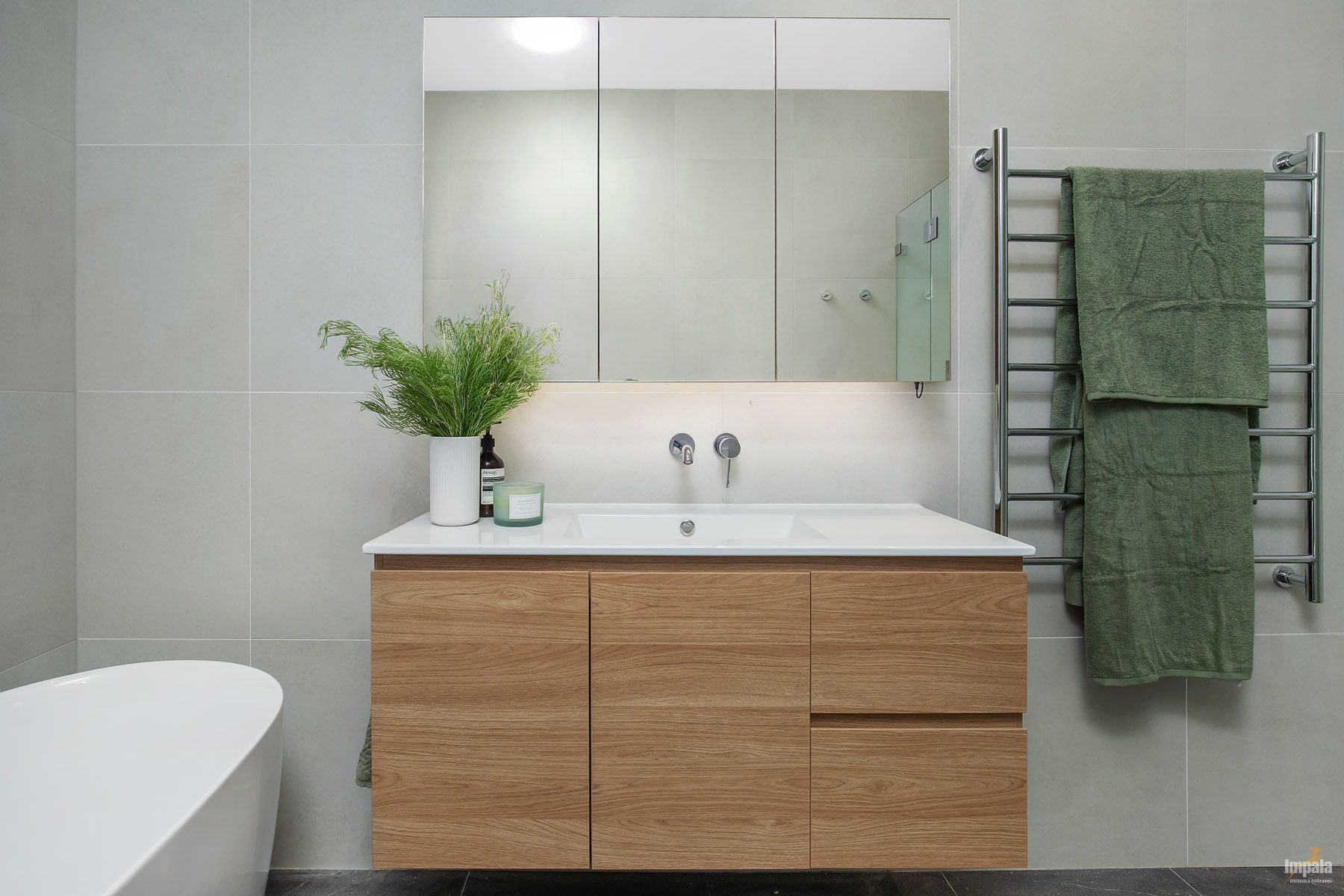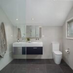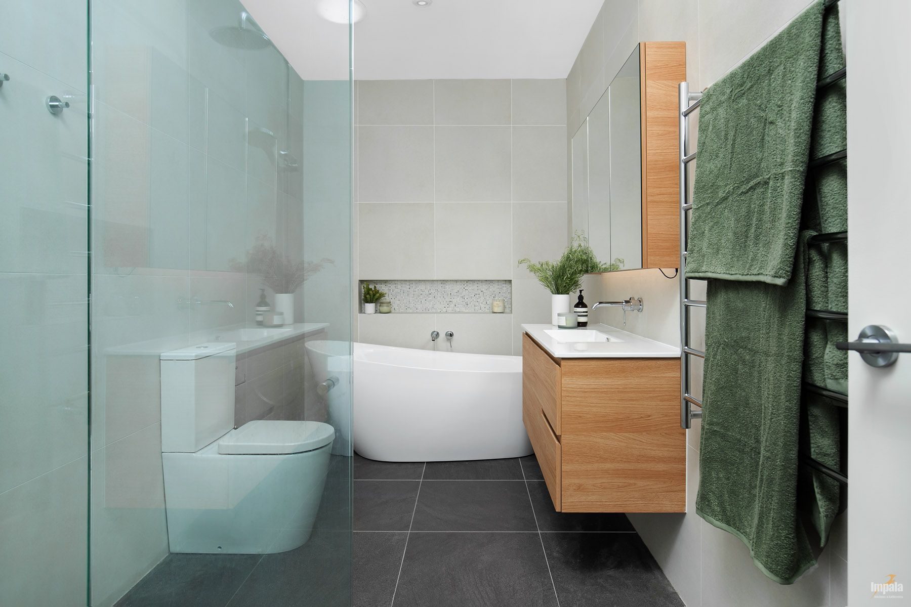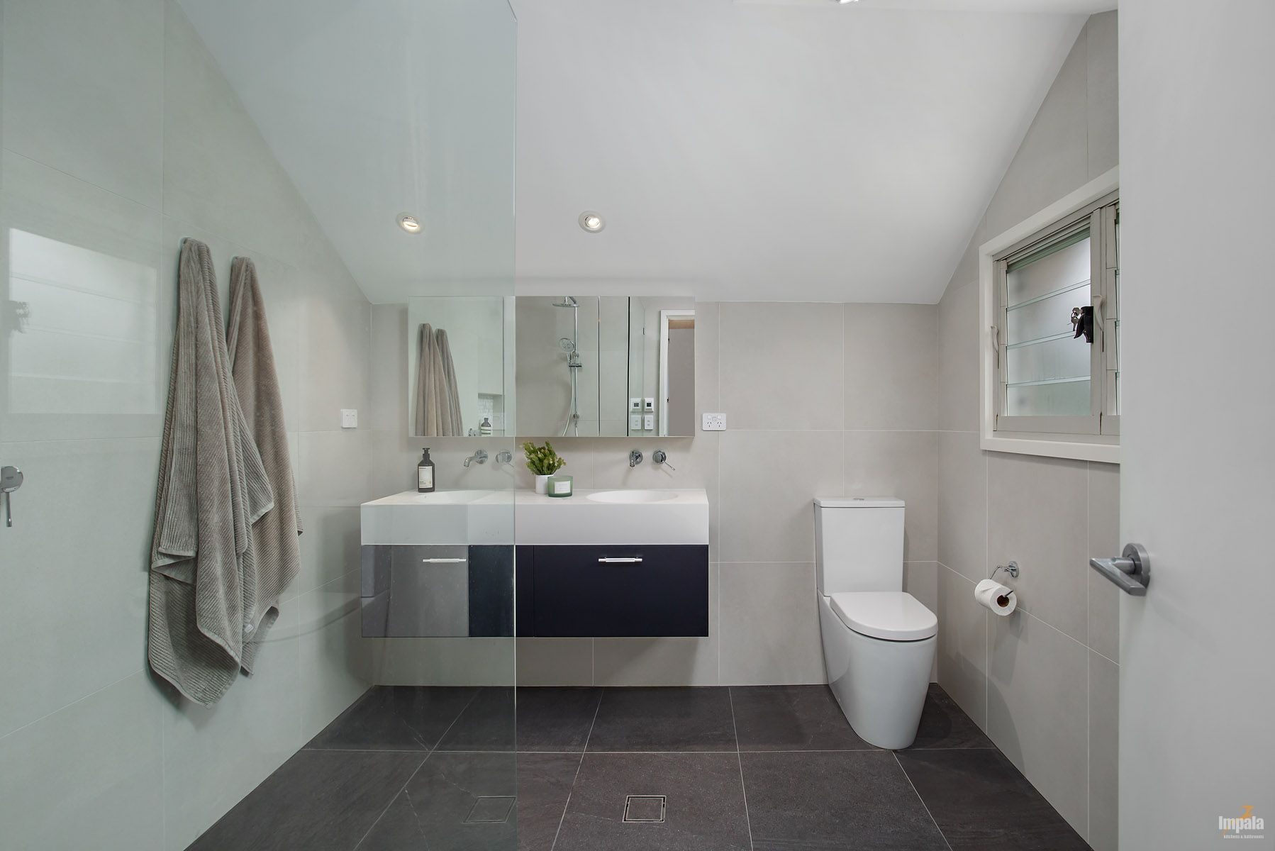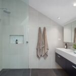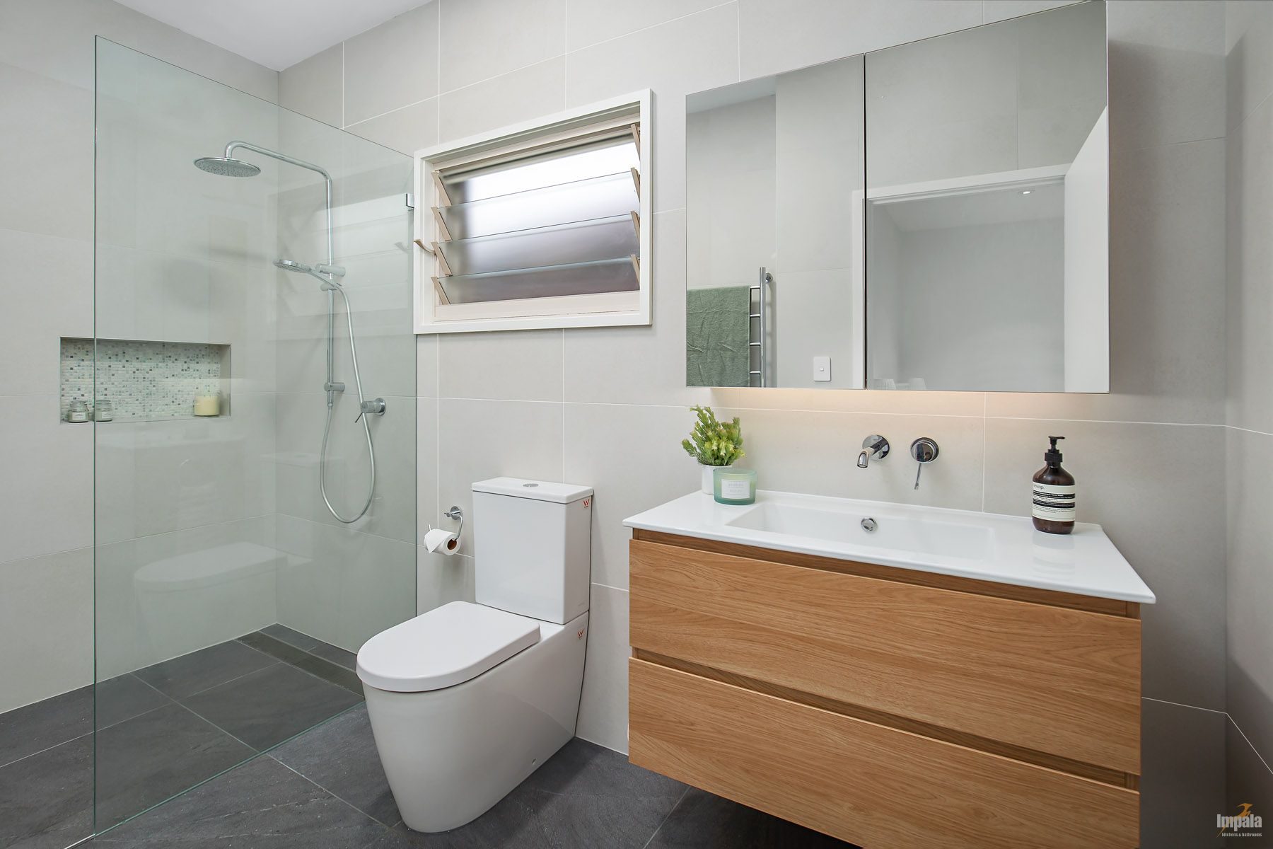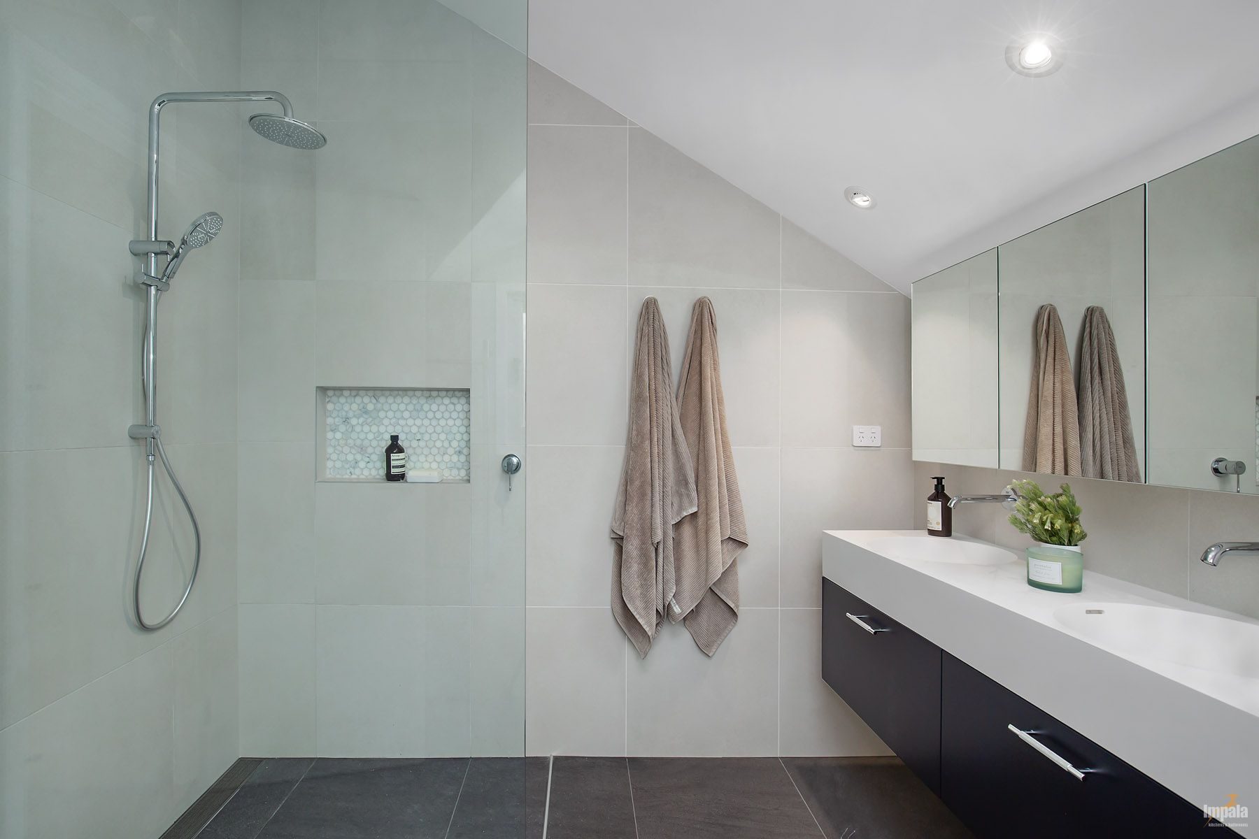 A neutral aesthetic was chosen for themain bathroom and the colour scheme continues