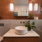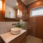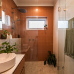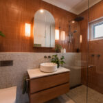On trend terrazzo and terracotta tones take this ensuite to the next level. The timber vanity, fluted glass and happy pot plants add to the warm organic appeal.
