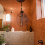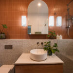 The dramatic finger tiles add interest and texture and the colour choice is bold and on trend. Terrazzo on the floor on the nib wall is stylish and easy to live with. The ledge is a great addition for pot plants which give the bathroom such character. The timber vanity adds organic warmth and tones with the feature tile. Stylish wall lights provide task and ambient lighting and add to the style of the space.