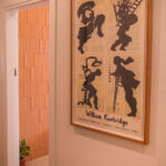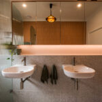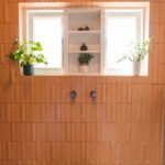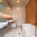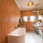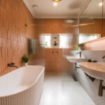 The dramatic finger tiles add interest and texture and the colour choice is bold and on trend. Terrazzo on the floor on the nib wall is stylish and easy to live with. The ledge is a great addition for pot plants which give the bathroom such character. The timber vanity adds organic warmth and tones with the feature tile. Stylish wall lights provide task and ambient lighting and add to the style of the space.