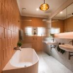 The stunning mix of materials is innovative and fresh ensuring this bathroom is enjoyed by the family that live here and their guests. The layout was improved dramatically delivering a functional and beautiful space. The colour choice is brave and on point. The design is stylish but very liveable for the family that live here and their guests.