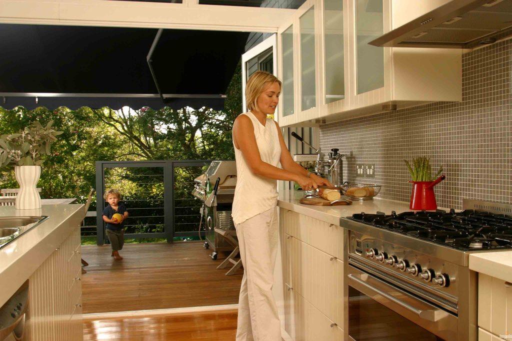 The client brief was to design a kitchen for a small family to suit the open space extension in a freestanding cottage in Sydney’s inner west. The kitchen was to be warm, inviting and functional. Impala recommended slatted polyurethane doors in an antique white hue. These were teamed with discreet top mounted handles to balance the texture on the doors. Warm, sliver grey mosaics were used for the splashback, to compliment the strong blue colour used on the home’s exterior. Frosted glass doors in over head cabinets were used for practicality but also to keep textures consistent with the extensive use of glass in the windows and louvers above the kitchen space. A thick bench top on the island anchors the space and the island provides seating for the family of three. A wire wine rack either side on the island is delicate and practical, completing the kitchen design symmetry.