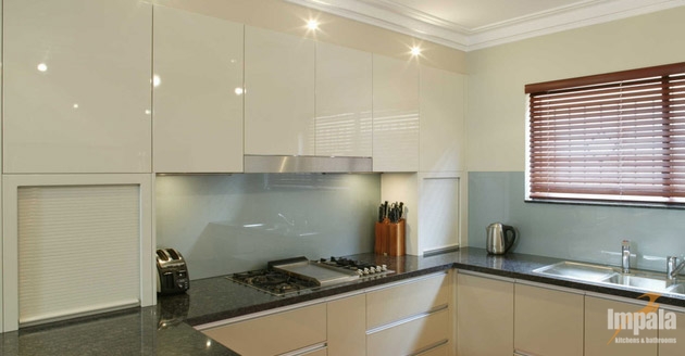 An antique white high gloss polyurethane door was selected to be teamed with a contrasting black granite bench top. A sleek metallic painted glass splashback adds to the contemporary kitchen aesthetic.