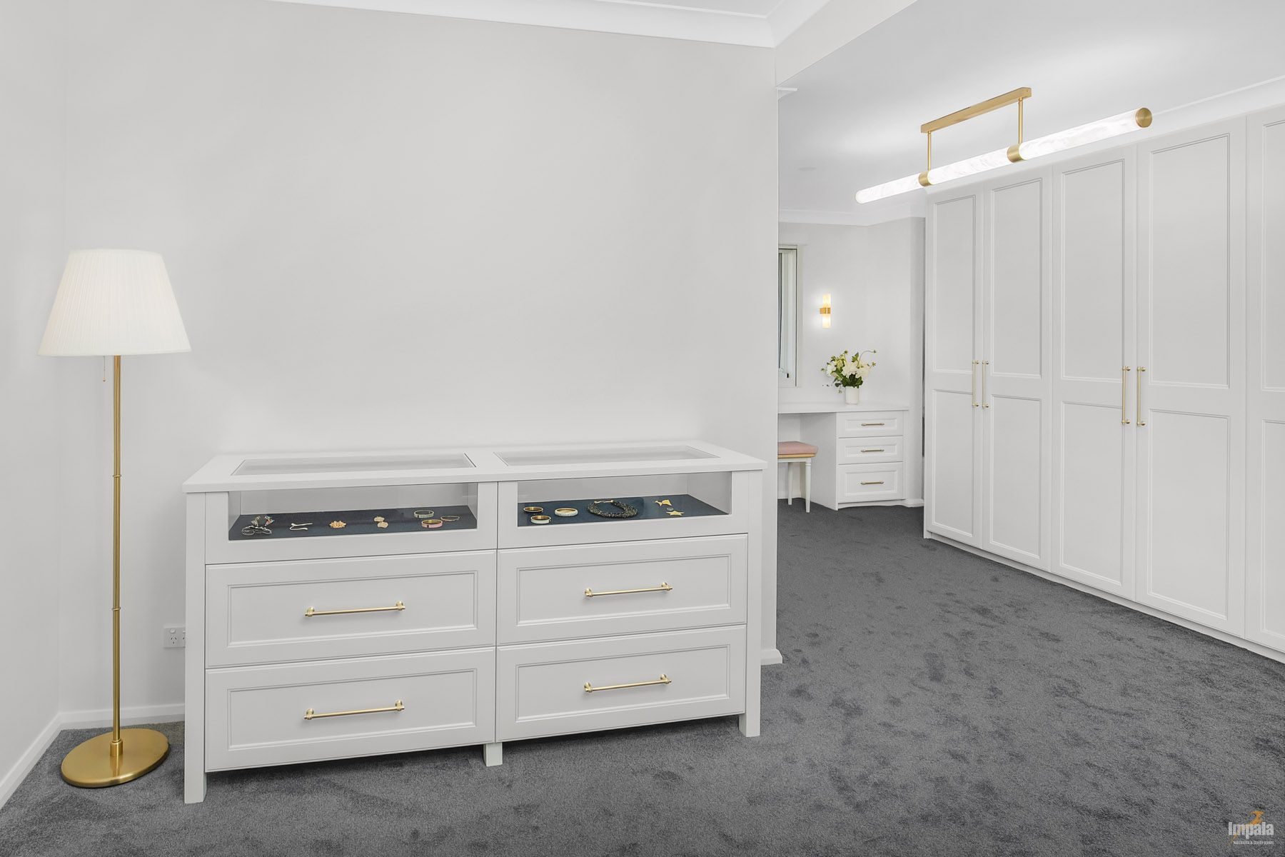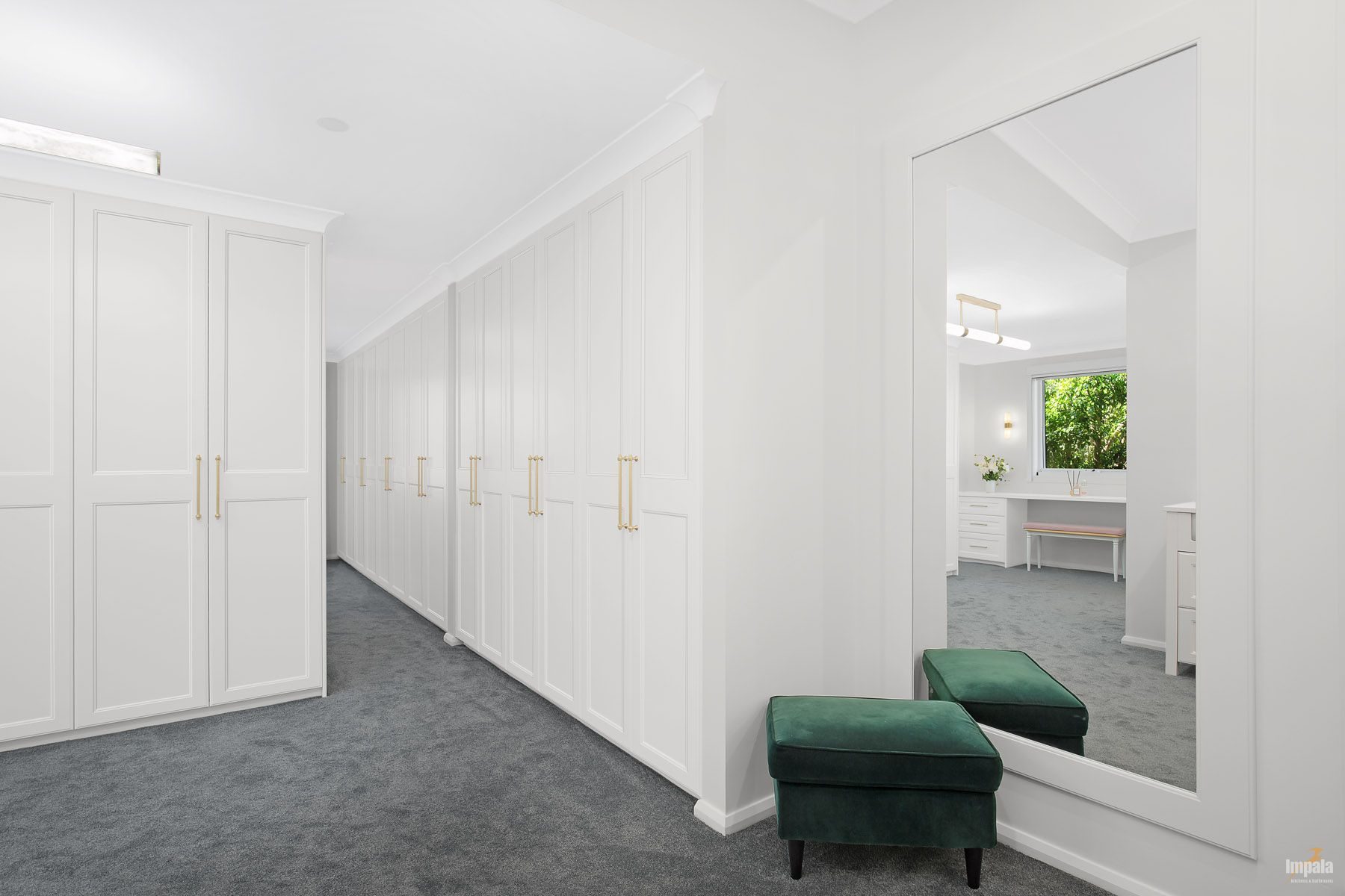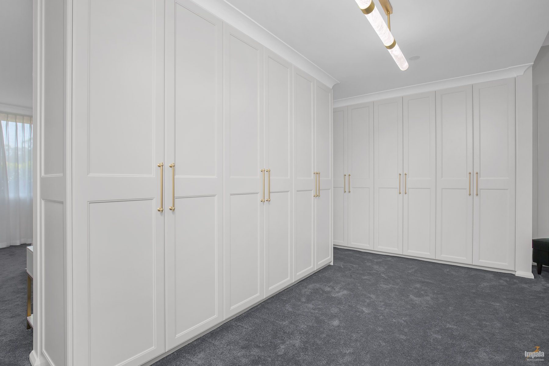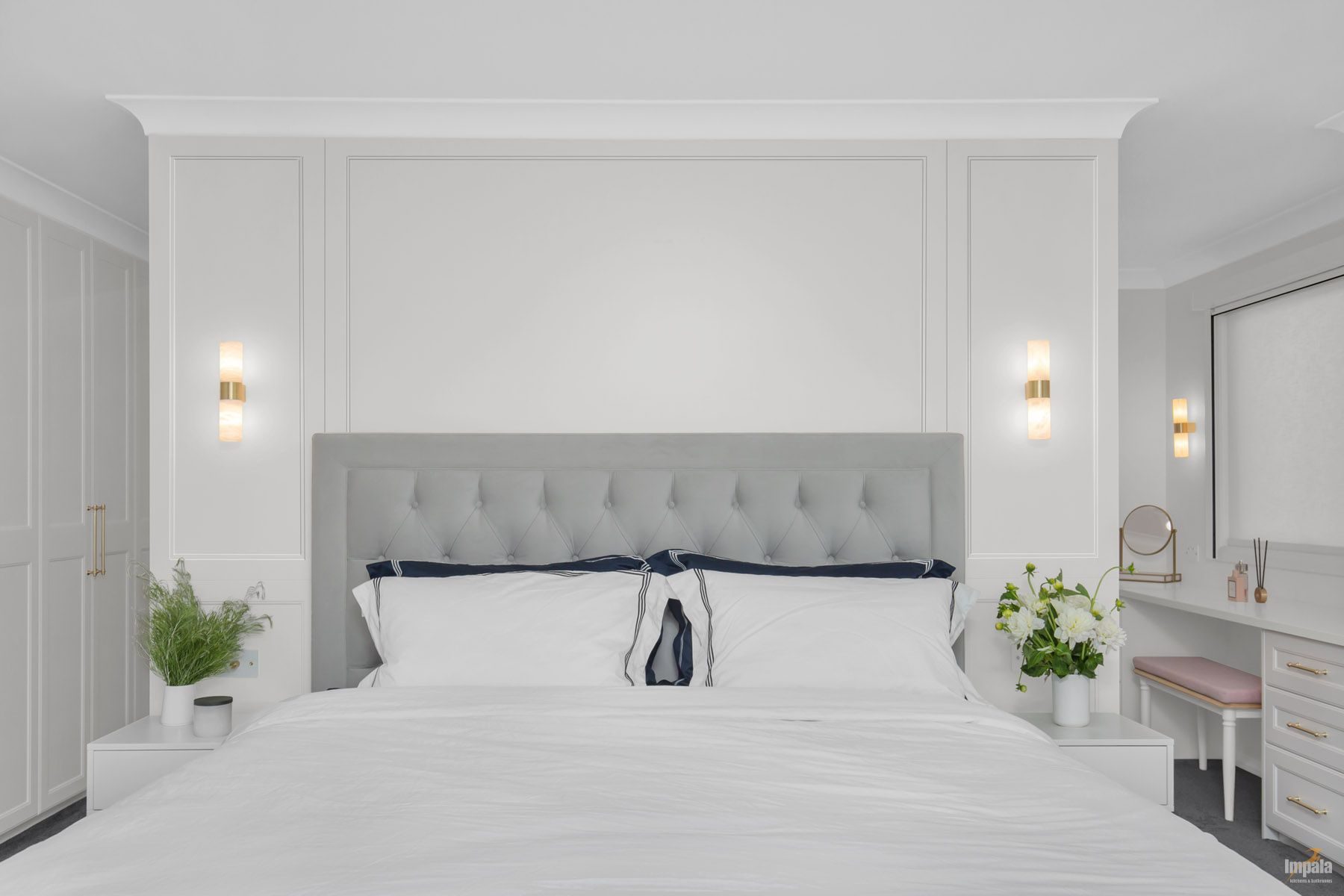 The panelled bedhead hides serious wardrobe storage with another whole wall of joinery. Shaker doors create a modern classic look and feature lighting adds understated luxury.
