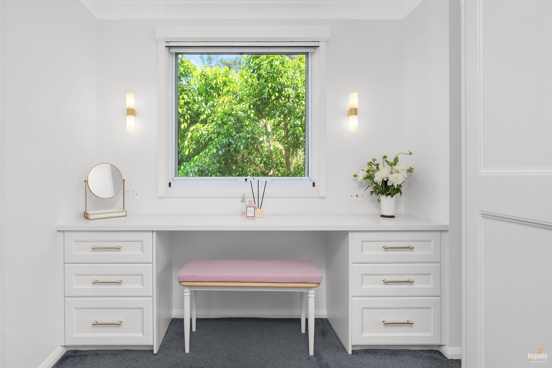 The inclusion of a full length dressing table makes the most of the leafy outlook and keeps