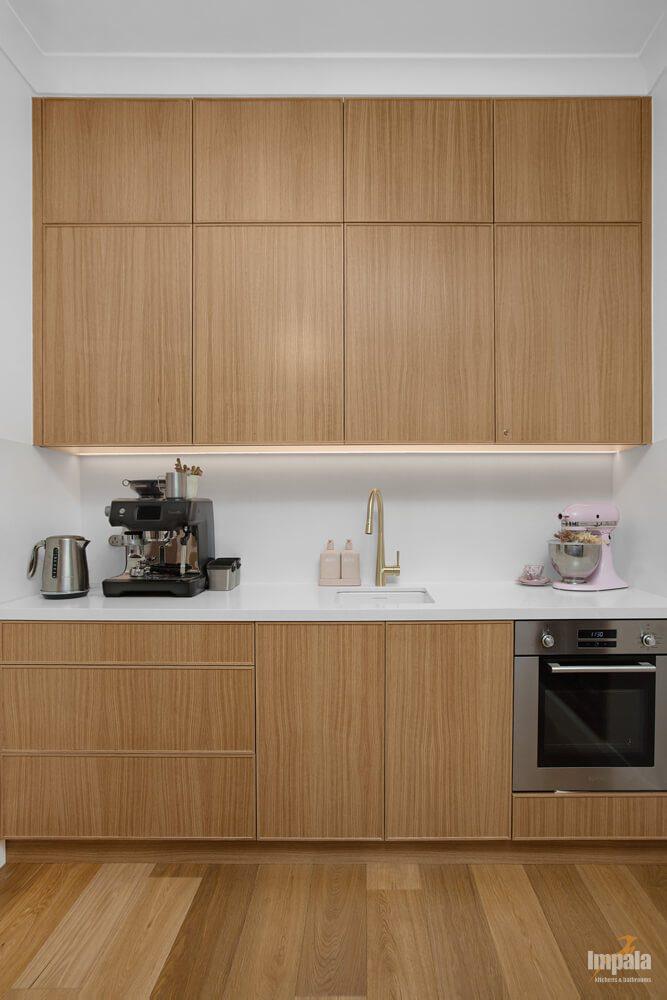 Chunky timber legs are offset by the gold metal shadowline and timber ribbed panels add interest and echo the ribbed glass used as a feature in the joinery.