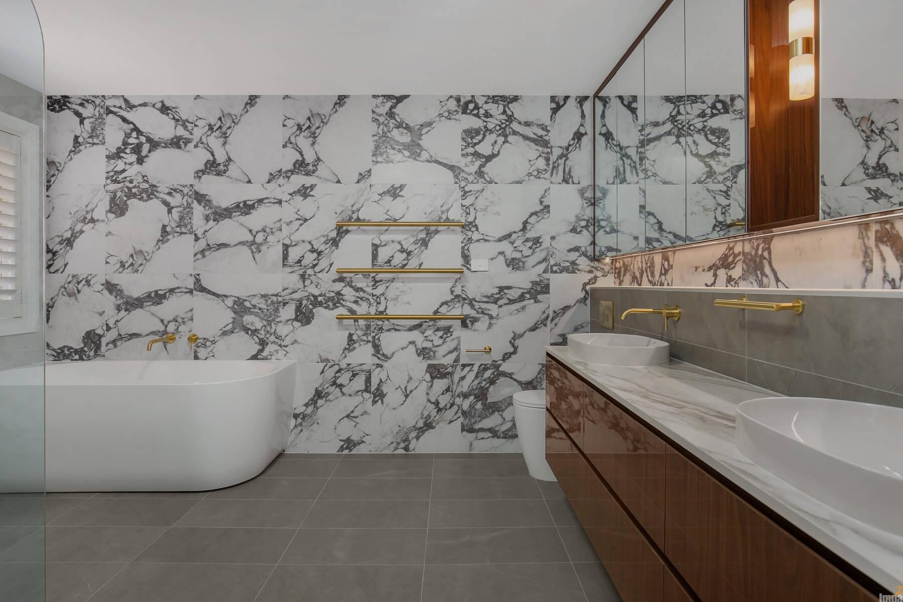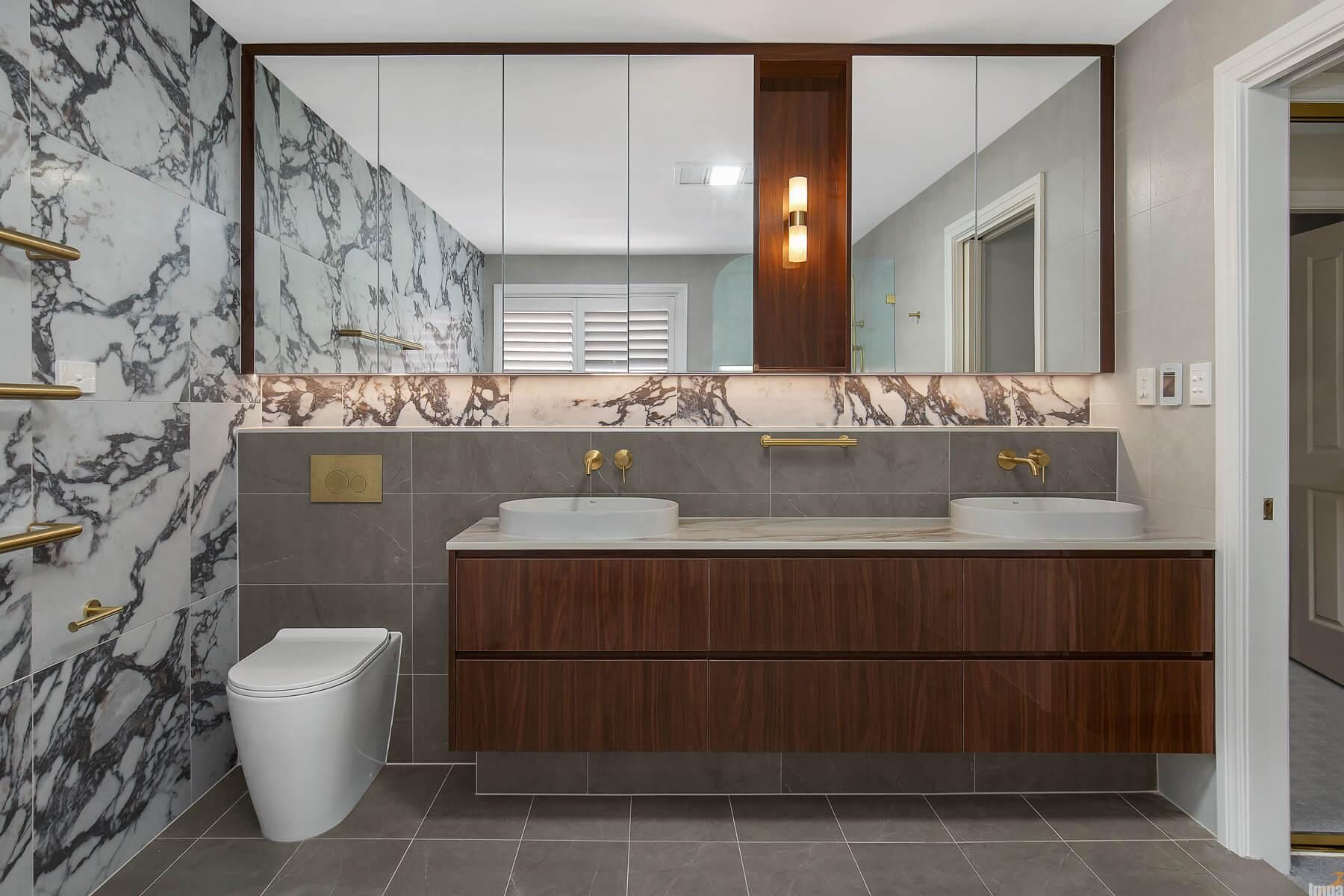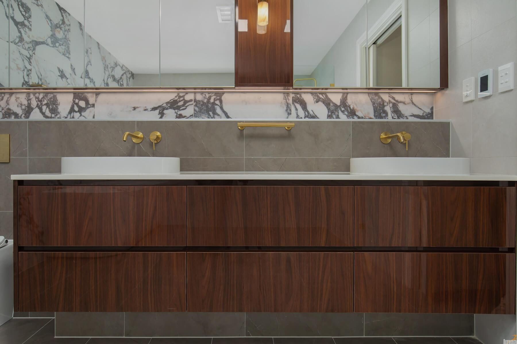 To soften the bold stone, warm timber-grain vanity joinery has been introduced. Impala Kitchens, like few bathroom remodeling services in Sydney, use natural tones to add richness and contrast, preventing the space from feeling cold or clinical. Paired with brushed brass tapware, towel rails and fixtures, the result is a sophisticated palette that feels inviting and luxurious without being overdone.